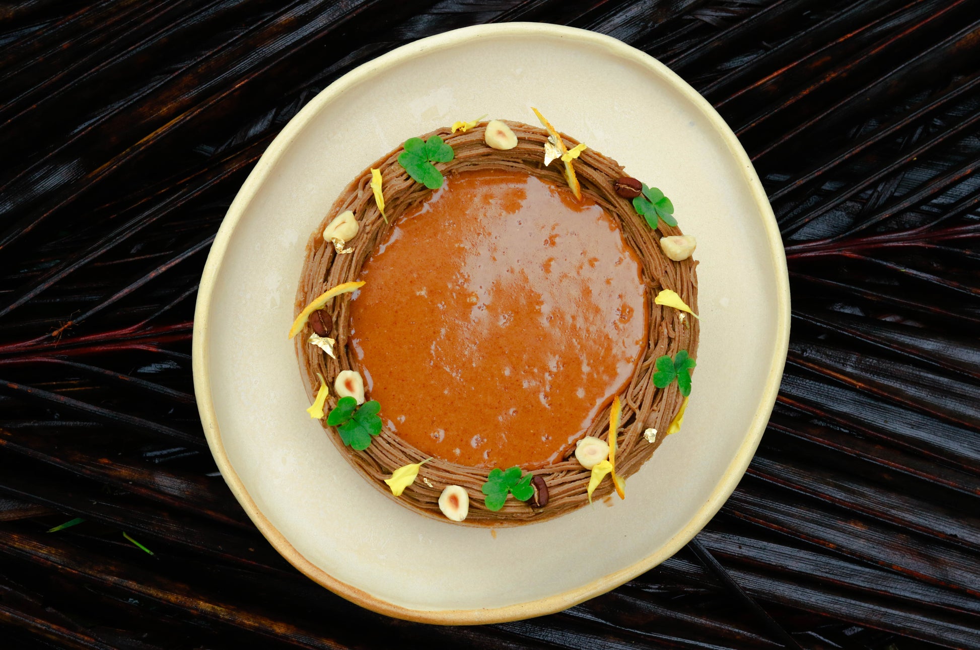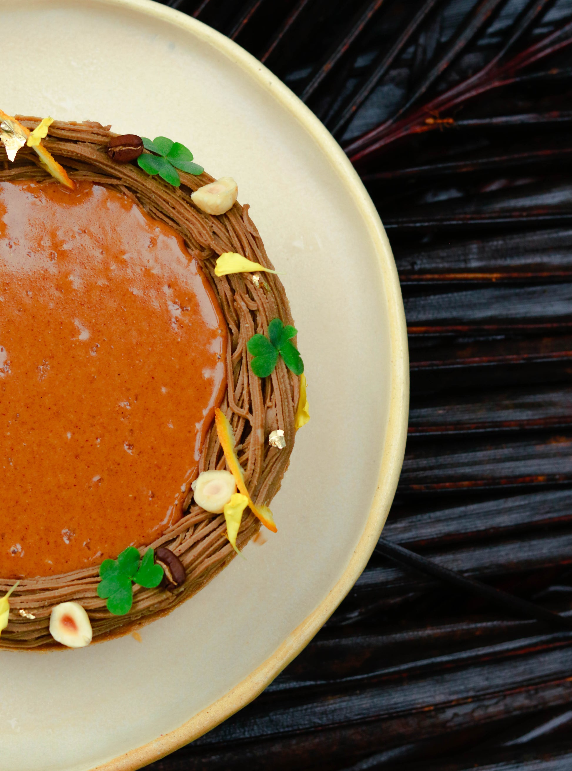 - Hazelnut praline coffee cheesecake : hazelnut orange crumble, hazelnut coffee cold cheesecake, coffee mousseline, hazelnut praline paste